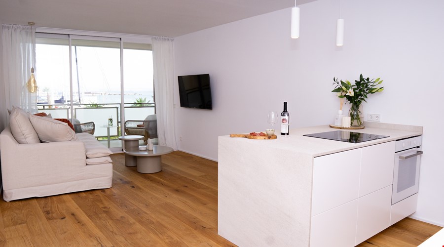 On entering the apartment, an open plan living and kitchen area flows naturally onto both the balcony and terrace. Large windows and sliding doors flood the space with natural light and frame the sweeping views across the bay. The modern kitchen integrates seamlessly into the living area, creating the perfect setting for relaxed gatherings and indoor outdoor living.