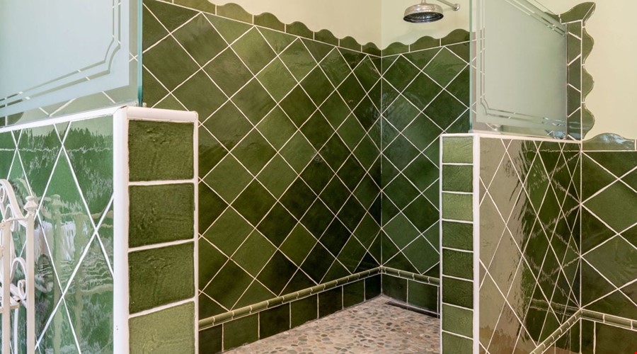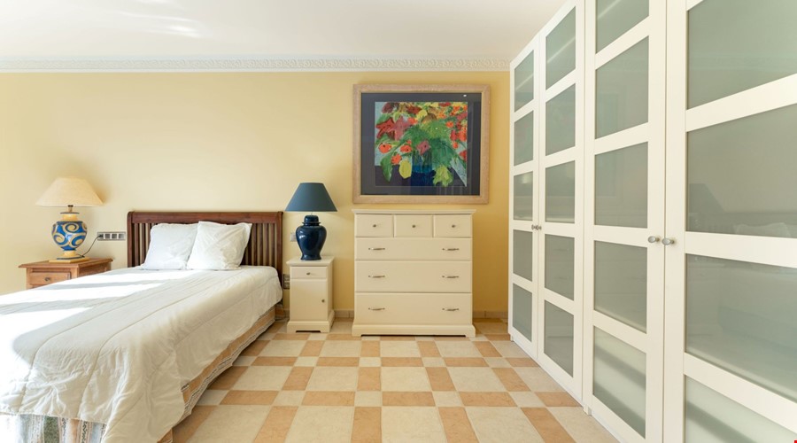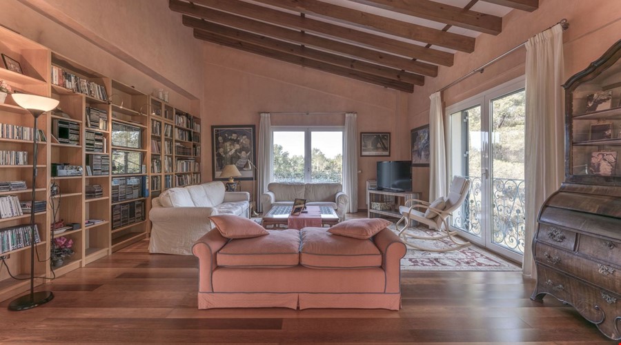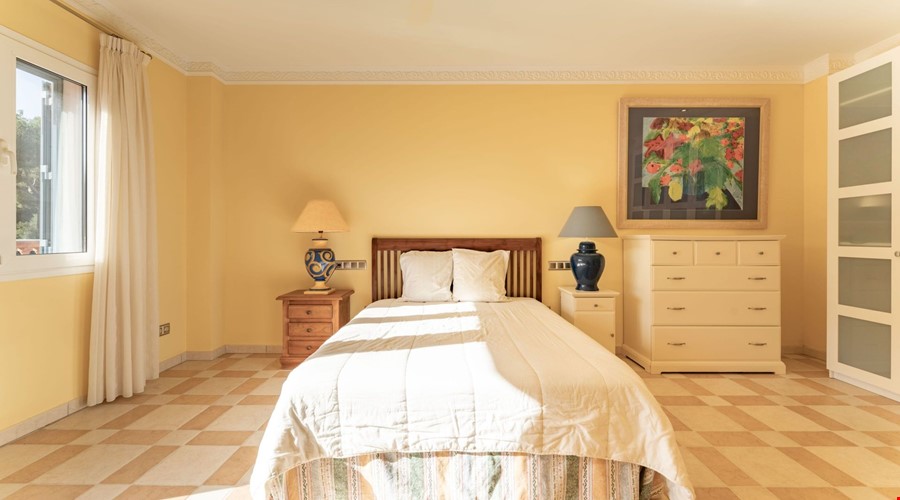 Moving upstairs, the volume of the house really becomes apparent. The second lounge features high ceilings with exposed wooden beams, which changes the whole atmosphere of the floor. It feels airy and much larger than a standard villa. There are two more double bedrooms on this level, and both step out onto a shared terrace that looks over the pool and the gardens. The bathroom on this floor includes a jacuzzi, which is a nice touch for the master suite.