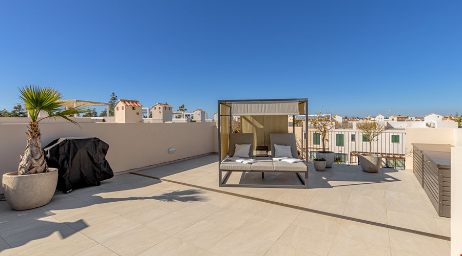 An approximately 13 m² balcony serves as an outdoor extension of the living area whilst also providing access to the approximately 70 m² private roof terrace, which offers an impressive 360-degree panoramic view over the sea, the offshore island of Cabrera, the surrounding mountain landscape and the village church of Ses Salines.