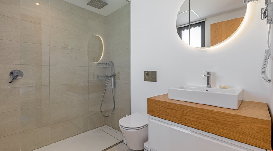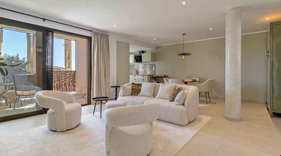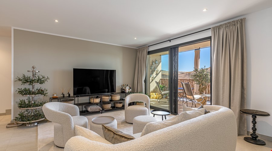 This brand-new penthouse apartment extends over approximately 91 m² of living space and features two bedrooms with double beds and two bathrooms, equipped with walk-in rain showers and towel warmers (one bathroom en suite).