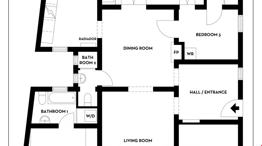 The master bedroom features an en suite bathroom with bathtub and direct access to the laundry area. One of the bedrooms has access to the exterior balcony, while the third bedroom includes a private balcony and en suite bathroom with shower. There is also a third independent bathroom.